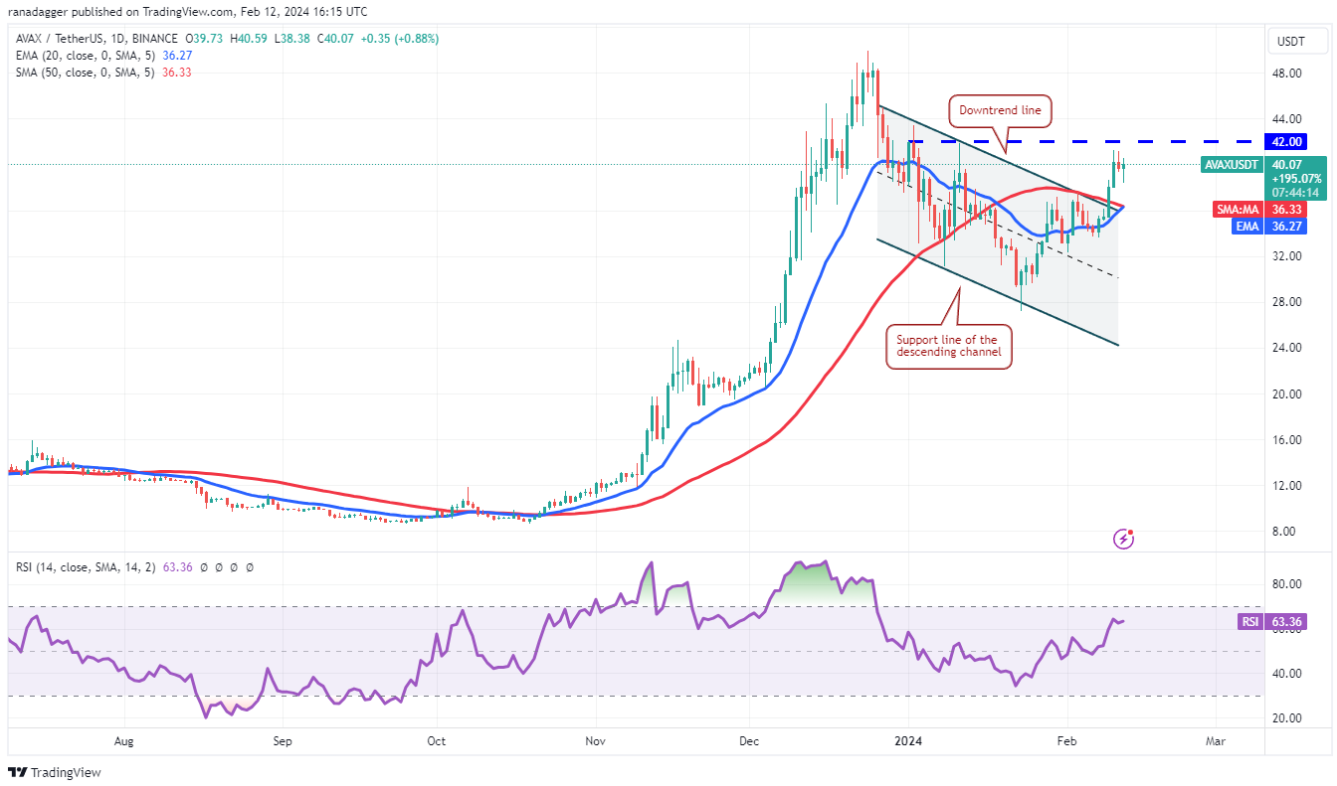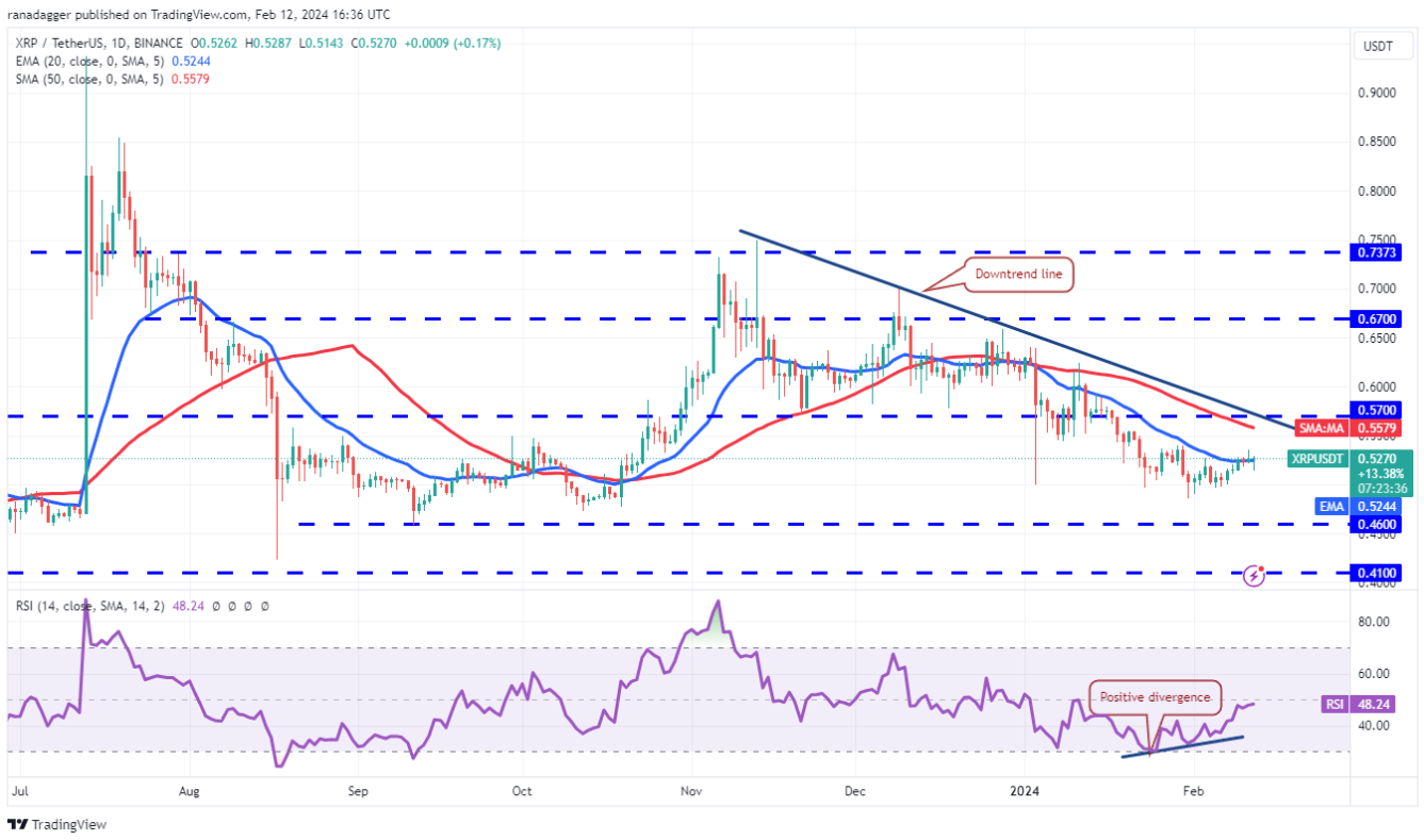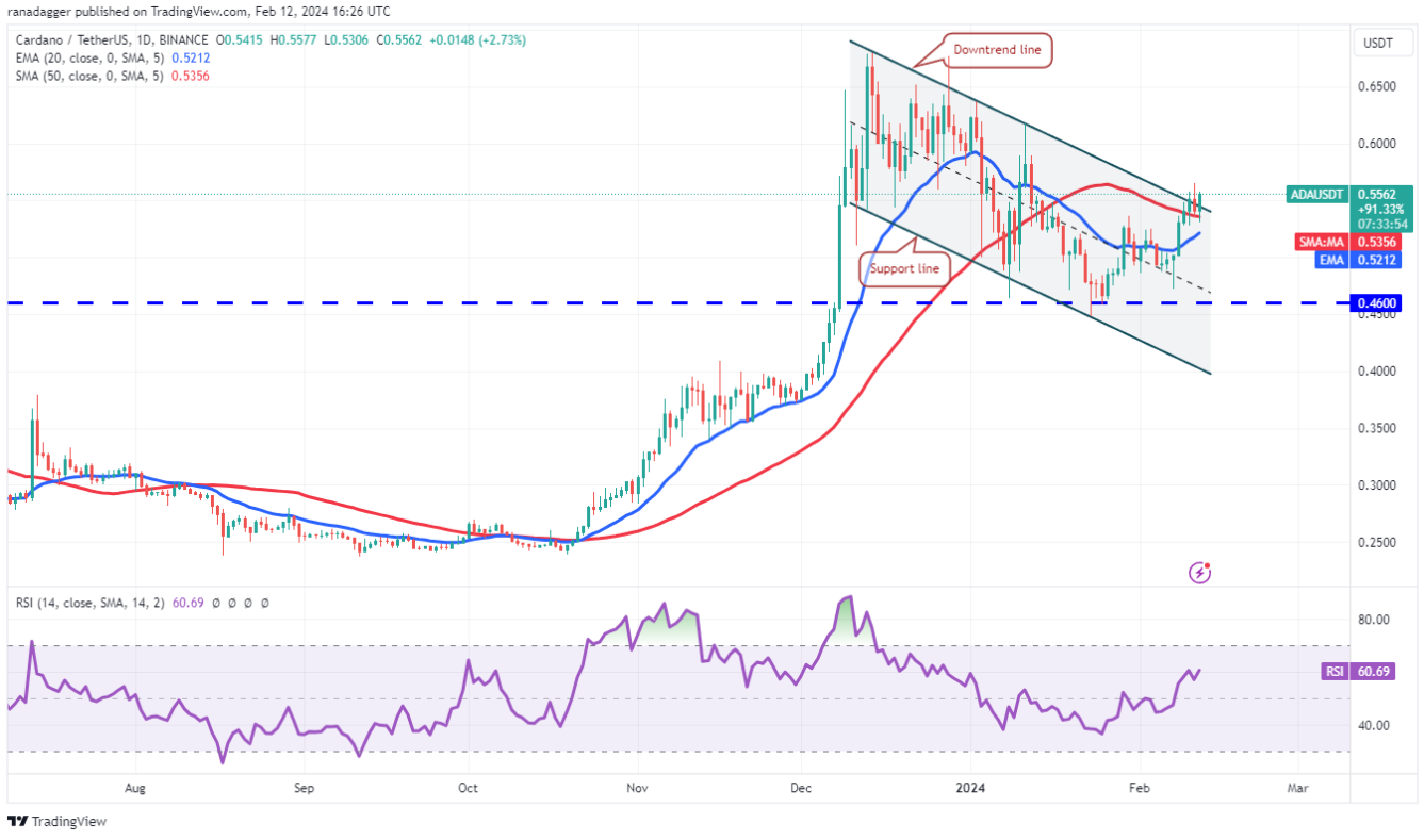 Phe bò đã đẩy giá lên trên kênh vào ngày 10 tháng 2, nhưng họ không thể xây dựng dựa trên sự đột phá vào ngày 11 tháng 2. Phe gấu đã cố gắng tận dụng tình hình và đẩy giá xuống dưới đường SMA 50 ngày ($0,53) vào 12 tháng 2, nhưng phe bò vẫn giữ vững lập trường của mình. Điều này cho thấy rằng mỗi đợt giảm giá nhỏ đều đang được mua vào. Người mua sẽ cố gắng đẩy cặp ADA/USDT lên $0,62 và sau đó là $0,68.
