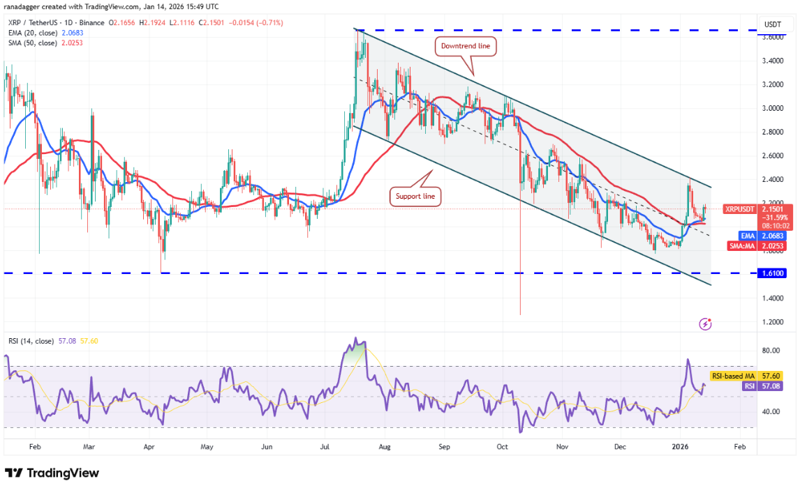Đường EMA 20 ngày (2,06 USD) dốc lên cùng RSI nằm trong vùng tích cực cho thấy phe bò đang chiếm ưu thế. Điều này làm tăng khả năng giá phá vỡ đường xu hướng giảm, báo hiệu một sự thay đổi xu hướng tiềm năng. Khi đó, cặp XRP/USDT có thể tăng lên 2,70 USD.