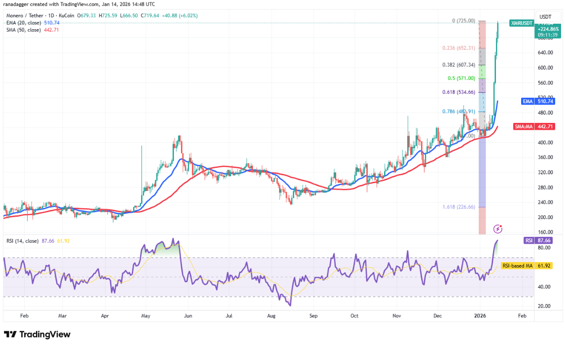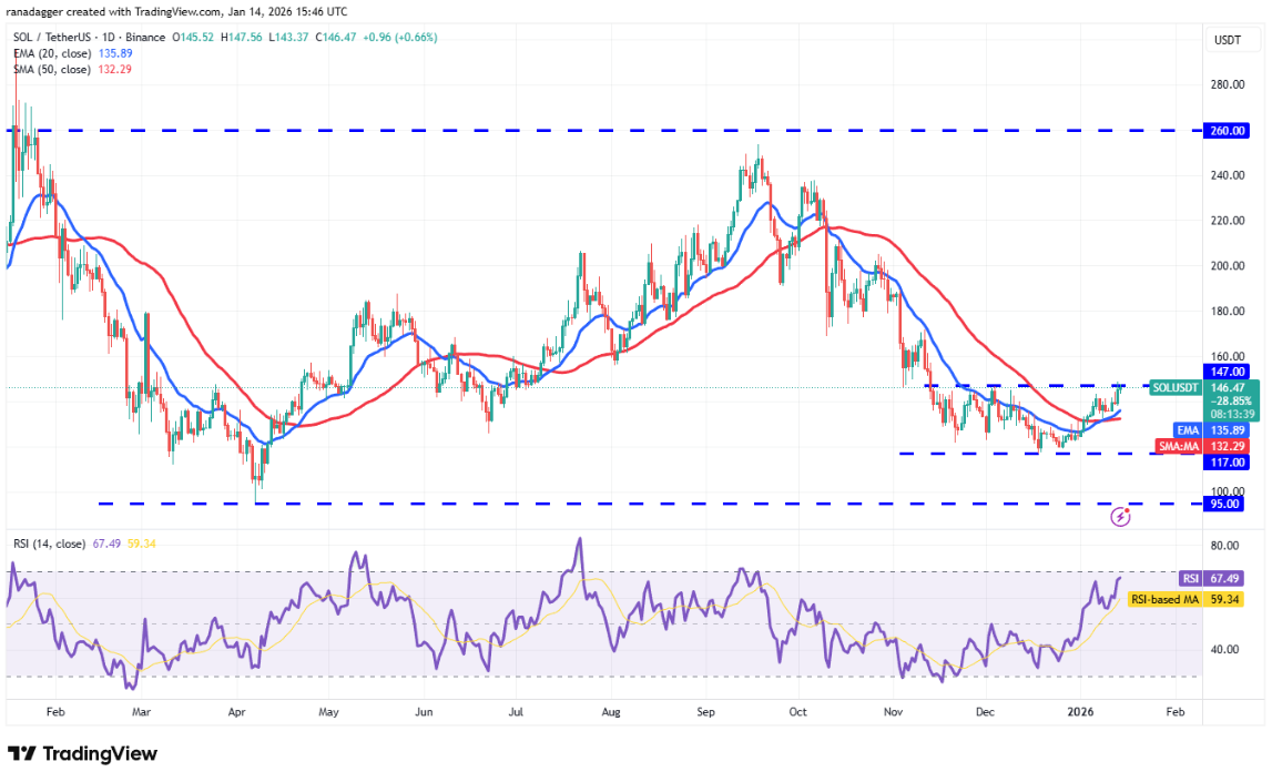 Đường EMA 20 ngày (135 USD) dốc lên cùng RSI gần vùng quá mua cho thấy xu hướng chủ đạo vẫn là đi lên. Nếu phe bò vượt qua được mốc 147 USD, cặp SOL/USDT có thể tăng tốc và vươn tới 172 USD.