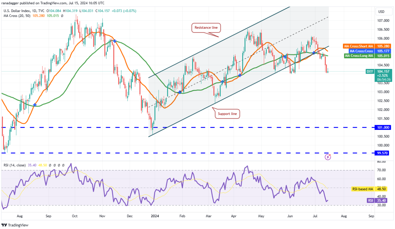 Phe bò đã cố gắng đẩy chỉ số đô la Mỹ (DXY) lên trên SMA 50 ngày (105) vào ngày 9 tháng 7, nhưng phe gấu vẫn giữ vững lập trường.