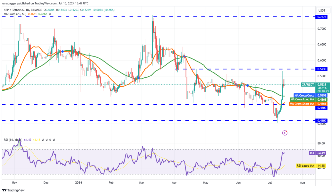 XRP (XRP) đã tăng trên đường SMA 20 ngày ($0,46) vào ngày 12 tháng 7 và sau đó tăng mạnh lên $0,57 vào ngày 13 tháng 7.