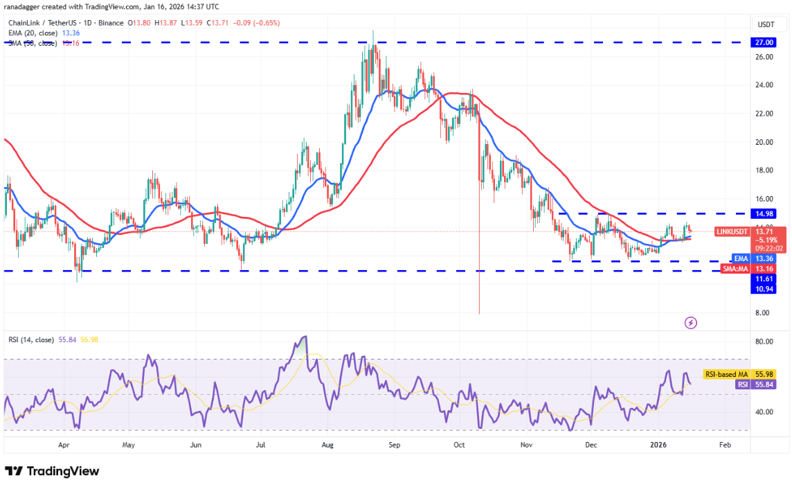 Chainlink vẫn đang dao động trong biên độ từ 11,61 USD đến 14,98 USD, cho thấy lực mua xuất hiện gần vùng hỗ trợ và lực bán gia tăng khi giá tiến sát vùng kháng cự.