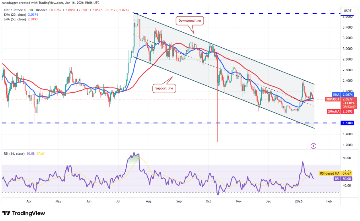 Phe gấu sẽ cố gắng kéo giá XRP xuống dưới SMA 50 ngày tại $2,01. Nếu thành công, cặp XRP/USDT có thể tiếp tục dao động trong kênh giảm thêm một thời gian.