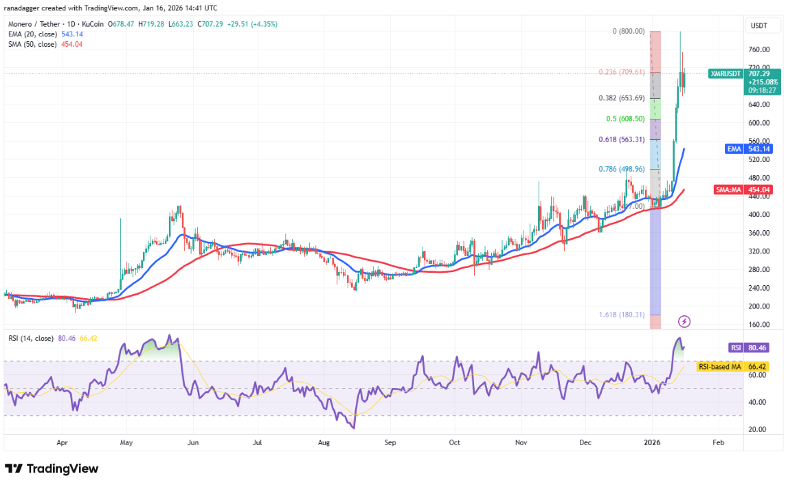 Đợt điều chỉnh được kỳ vọng sẽ tìm thấy hỗ trợ tại mức Fibonacci thoái lui 38,2% ở 653 USD và thấp hơn là mức 50% tại 608 USD. Nếu giá bật tăng trở lại từ các vùng hỗ trợ này, phe bò sẽ tiếp tục nỗ lực đẩy cặp XMR/USDT vượt mốc 800 USD. Nếu thành công, giá Monero có thể nối lại xu hướng tăng hướng tới 1.000 USD.