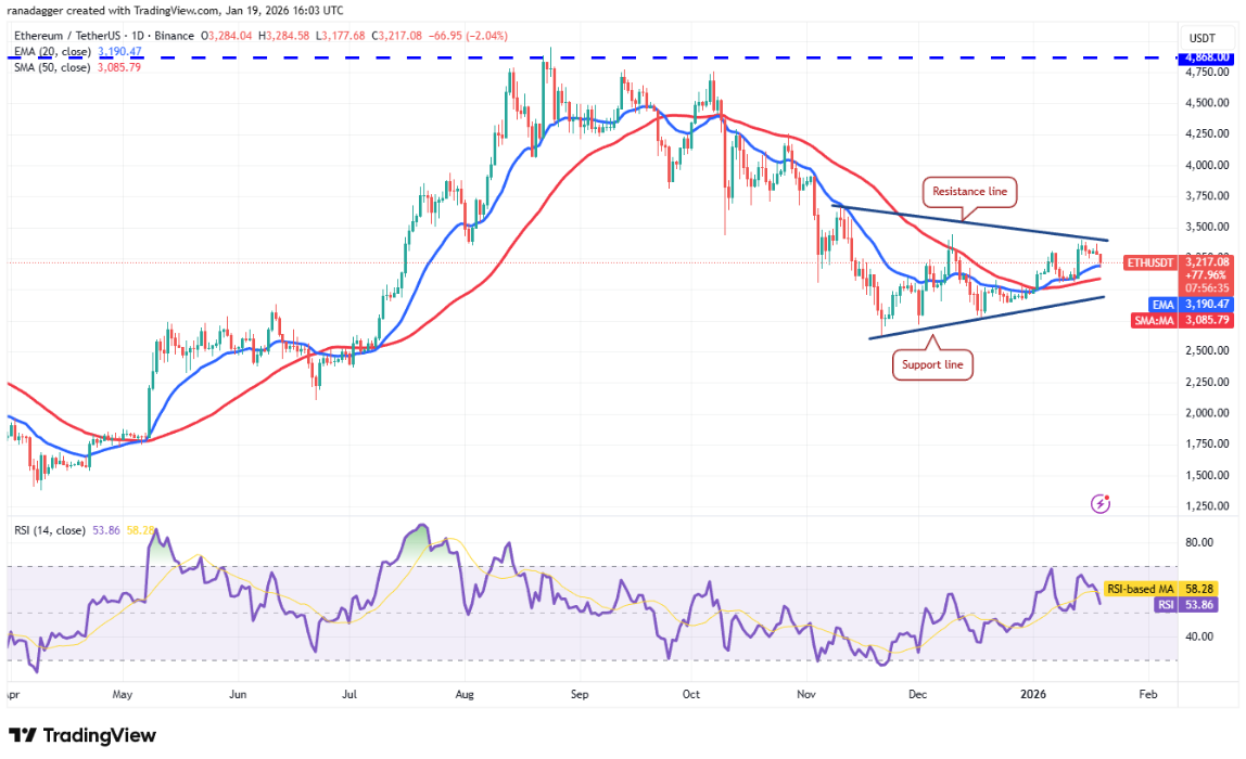 Đường EMA 20 ngày hơi dốc lên (3.190 USD) cùng chỉ số sức mạnh tương đối (RSI) quanh mức trung tính cho thấy chưa bên nào chiếm ưu thế rõ rệt. Nếu giá đóng cửa dưới EMA 20 ngày, cặp ETH/USDT có thể tiếp tục dao động bên trong mô hình tam giác.
