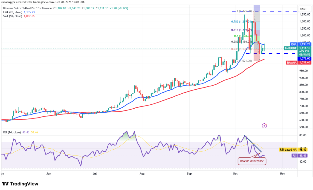 Mặc dù ngưỡng kháng cự tại EMA 20 ngày ($1.135) vẫn còn thử thách, nhưng nếu phe bò vượt qua được, cặp BNB/USDT có thể tiến tới mức Fibonacci thoái lui 50% tại $1.198. Sức mạnh của phe bò sẽ càng rõ rệt nếu giá phá mức Fib 61,8% ở $1.239, mở ra cơ hội kiểm tra lại đỉnh lịch sử $1.375.