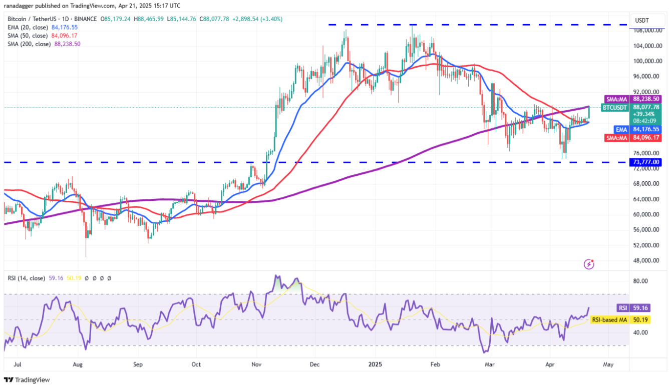 Các đường trung bình động đang chuẩn bị hoàn thành một bullish cross, và chỉ báo RSI đã quay trở lại vùng tích cực – những tín hiệu củng cố lợi thế cho phe bò. Nếu vượt qua đường SMA 200 ngày, điều đó cho thấy cặp BTC/USDT có thể đã tạo đáy ngắn hạn. Khi đó, giá có thể tăng vọt lên $95.000, và tiếp theo là mốc tâm lý quan trọng $100.000.