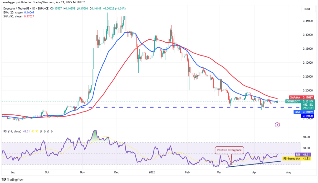 Đường EMA 20 ngày đi ngang và chỉ số RSI gần mức trung bình cho thấy cung và cầu đang ở trạng thái cân bằng. Nếu giá vượt và đóng cửa trên đường SMA 50 ngày ($0,17), lợi thế sẽ nghiêng về phe bò. Khi đó, cặp DOGE/USDT có thể tăng lên mức $0,21.