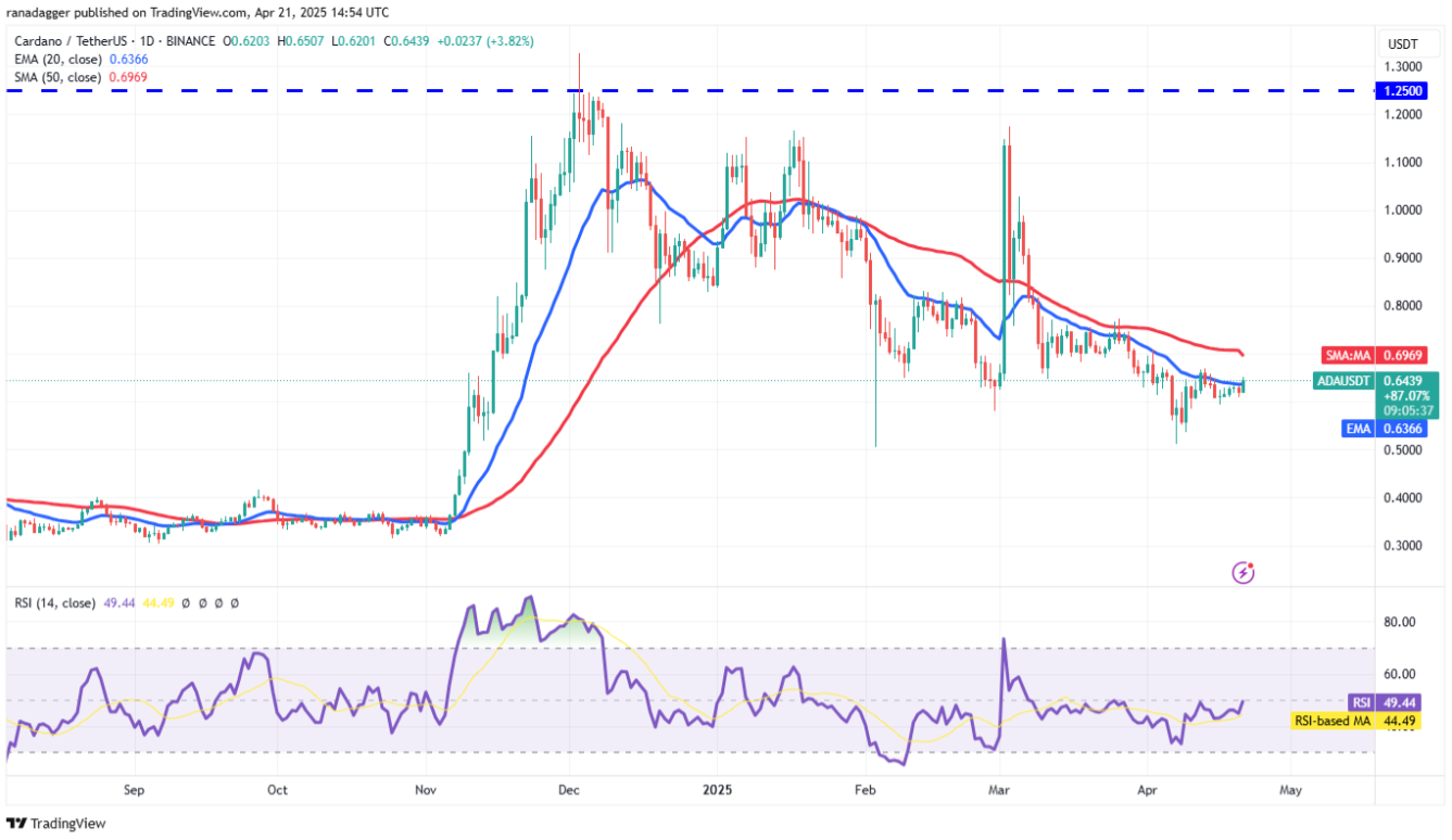 Phe bò đang cố gắng giữ giá Cardano (ADA) trên đường EMA 20 ngày ($0,63), cho thấy dấu hiệu phục hồi.