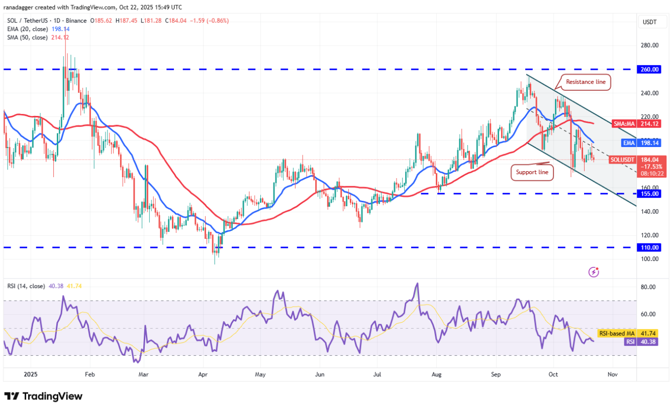 Cặp SOL/USDT có thể giảm về đường hỗ trợ của mô hình kênh giảm dần, nơi phe bò được kỳ vọng sẽ xuất hiện. Để duy trì thế cân bằng, phe bò cần đẩy giá vượt đường EMA 20 ngày. Nếu giá đóng cửa trên đường kháng cự của kênh, xu hướng tăng mới có thể bắt đầu.