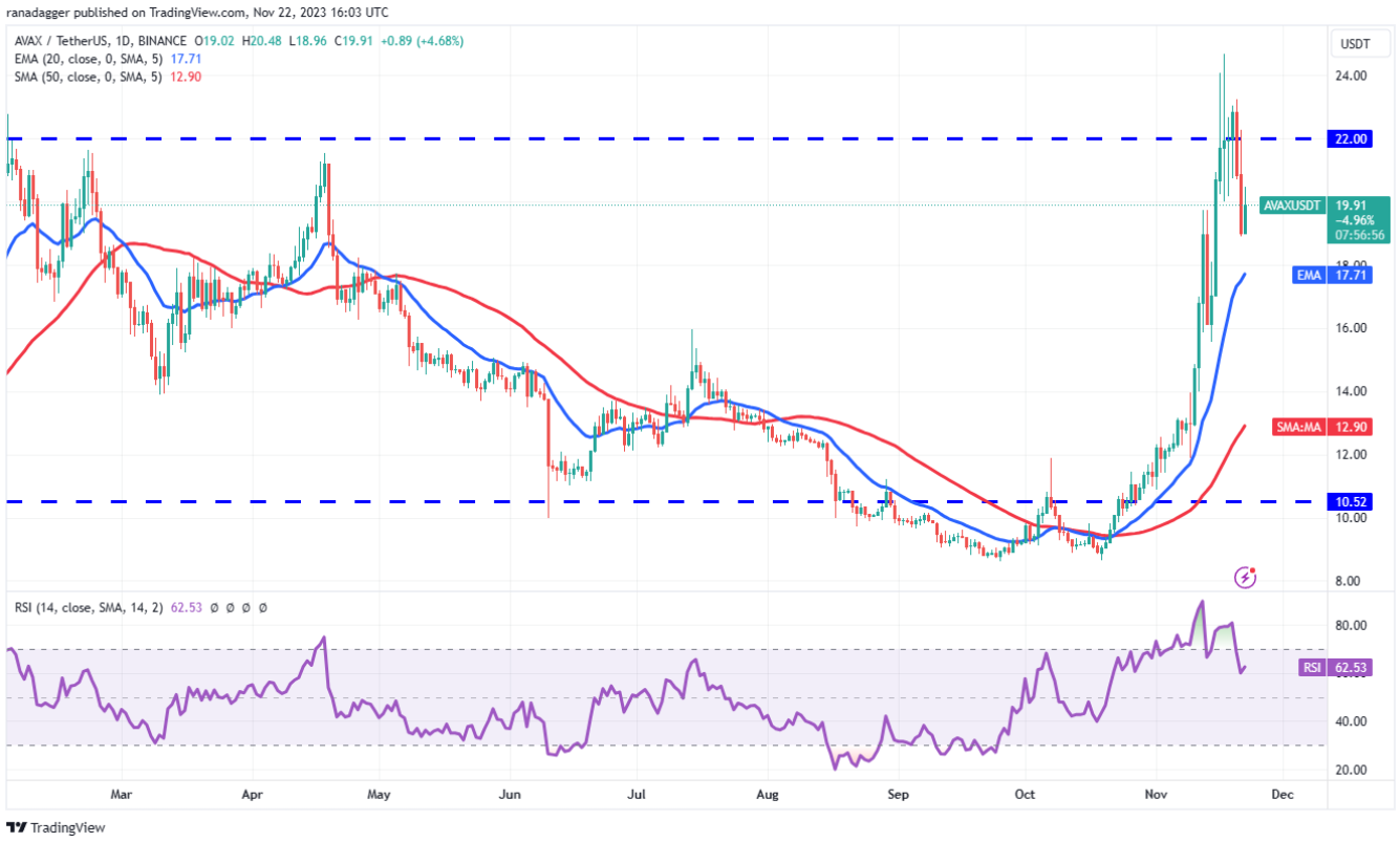Đường EMA 20 ngày ($17,71) đang dốc lên và chỉ số RSI nằm trong vùng tích cực, cho thấy phe bò đang chiếm thế thượng phong. Người mua sẽ lại cố gắng đẩy giá lên trên $22 và nếu họ thành công, điều đó sẽ gợi ý sự bắt đầu của một động thái tăng giá mới. Sau đó, cặp AVAX/USDT có thể bắt đầu hành trình hướng tới $30.