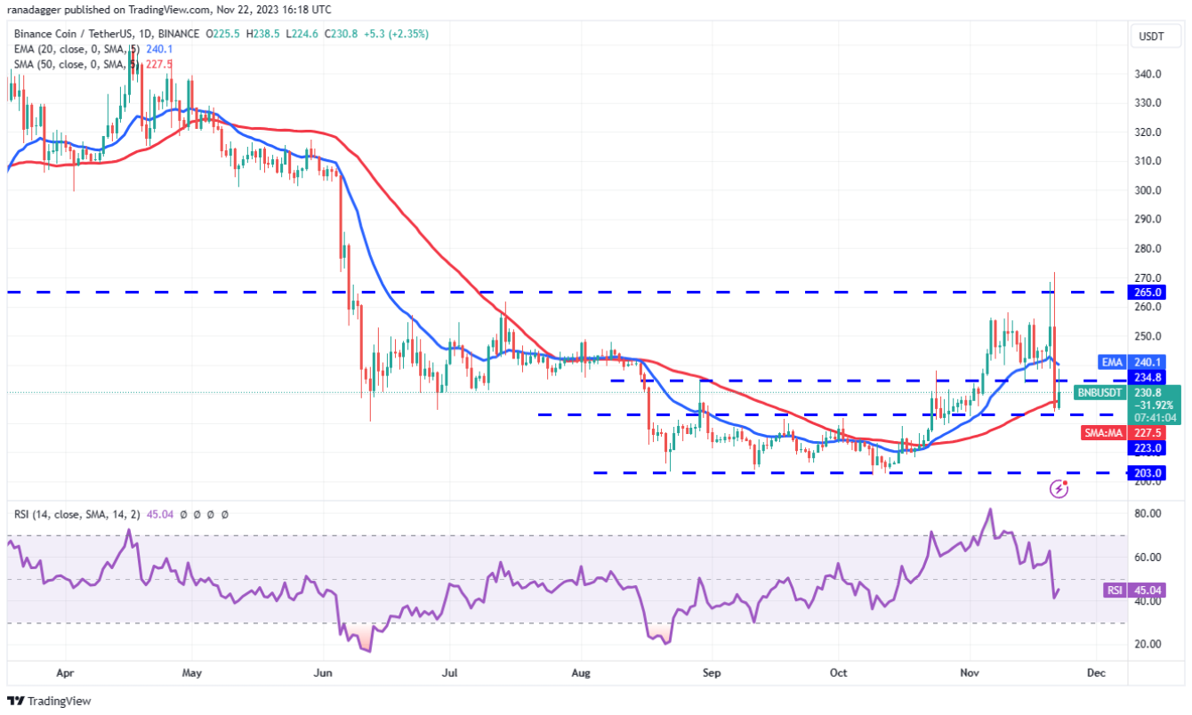 Một điểm tích cực nhỏ là phe bò đã không cho phép giá phá vỡ xuống dưới mức hỗ trợ chính ở $223. Điều đó đã bắt đầu phục hồi vào ngày 22 tháng 11 và phe bò đang cố gắng đẩy giá trở lại trên đường EMA 20 ngày ($240). Nếu họ thành công, điều đó sẽ báo hiệu rằng cặp BNB/USDT có thể hợp nhất trong khoảng từ $223 đến $265 thêm một thời gian.