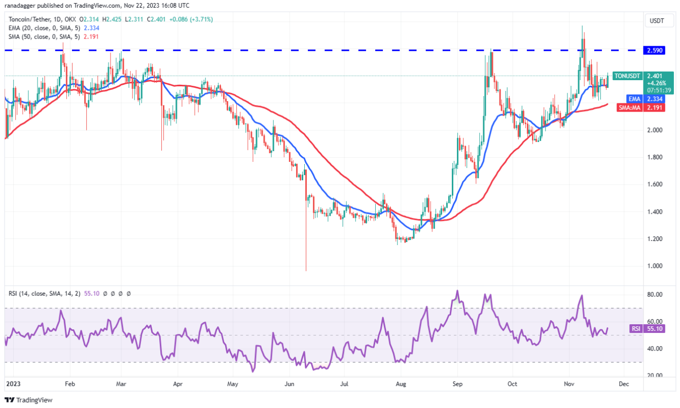 Toncoin (TON) đã tìm thấy hỗ trợ tại SMA 50 ngày ($2,19), cho thấy tâm lý vẫn tích cực và các trader đang mua khi giá giảm.