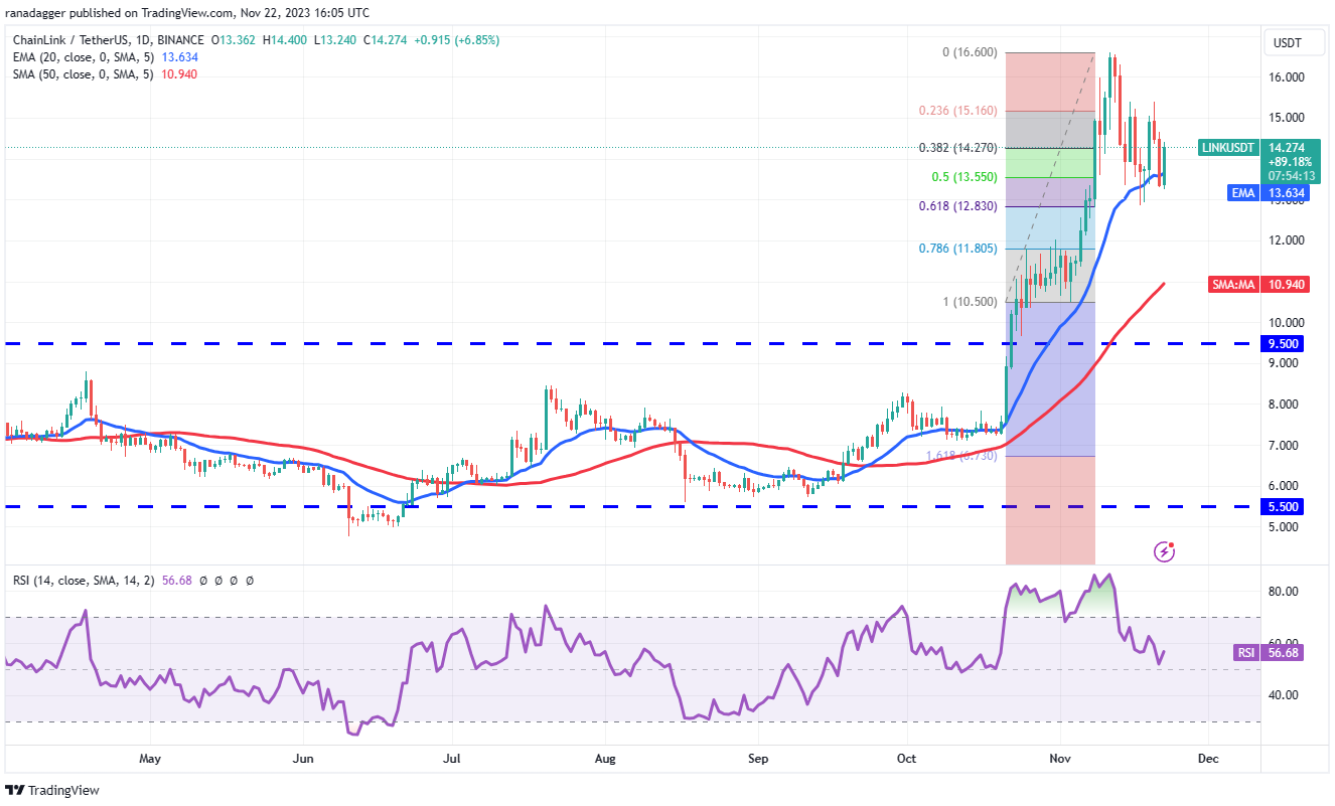Chainlink (LINK) đã giảm từ mức kháng cự gần nhất ở $15,39 vào ngày 20 tháng 11 và giảm xuống dưới đường EMA 20 ngày ($13,63) vào ngày 21 tháng 11.