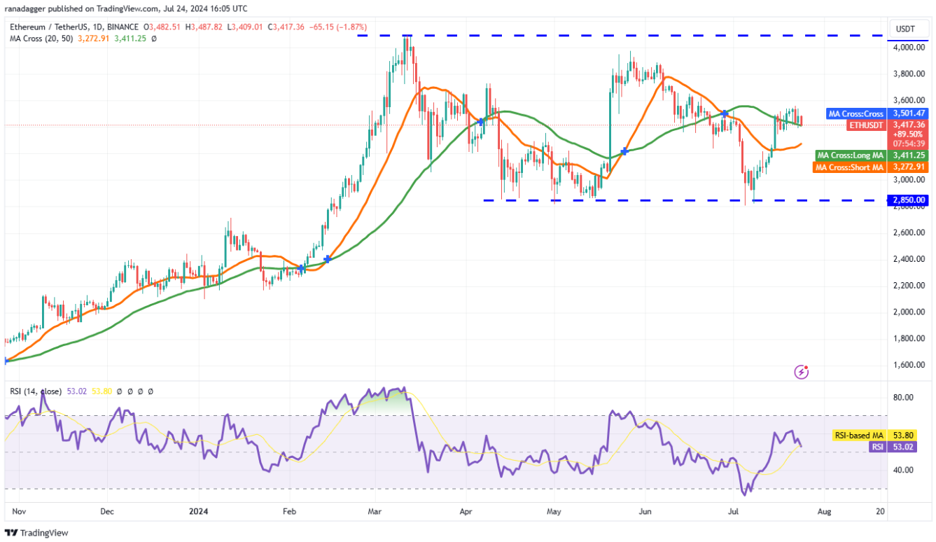 Ether đã tăng từ SMA 50 ngày ($3.411) vào ngày 23 tháng 7, nhưng phe bò đang phải vật lộn để duy trì đà tăng. Điều này cho thấy phe gấu đang hoạt động ở mức cao hơn.