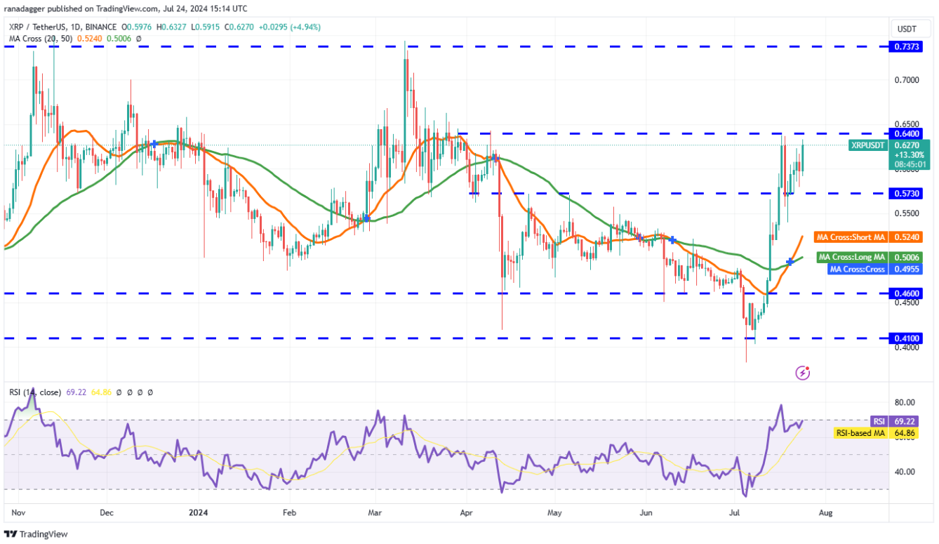 Hoạt động mua tăng lên vào ngày 24 tháng 7 và phe bò đang cố gắng vượt qua rào cản ở mức $0,64. Nếu thành công, cặp XRP/USDT có khả năng sẽ lấy lại đà tăng và tăng vọt về phía ngưỡng kháng cự mạnh là $0,74.