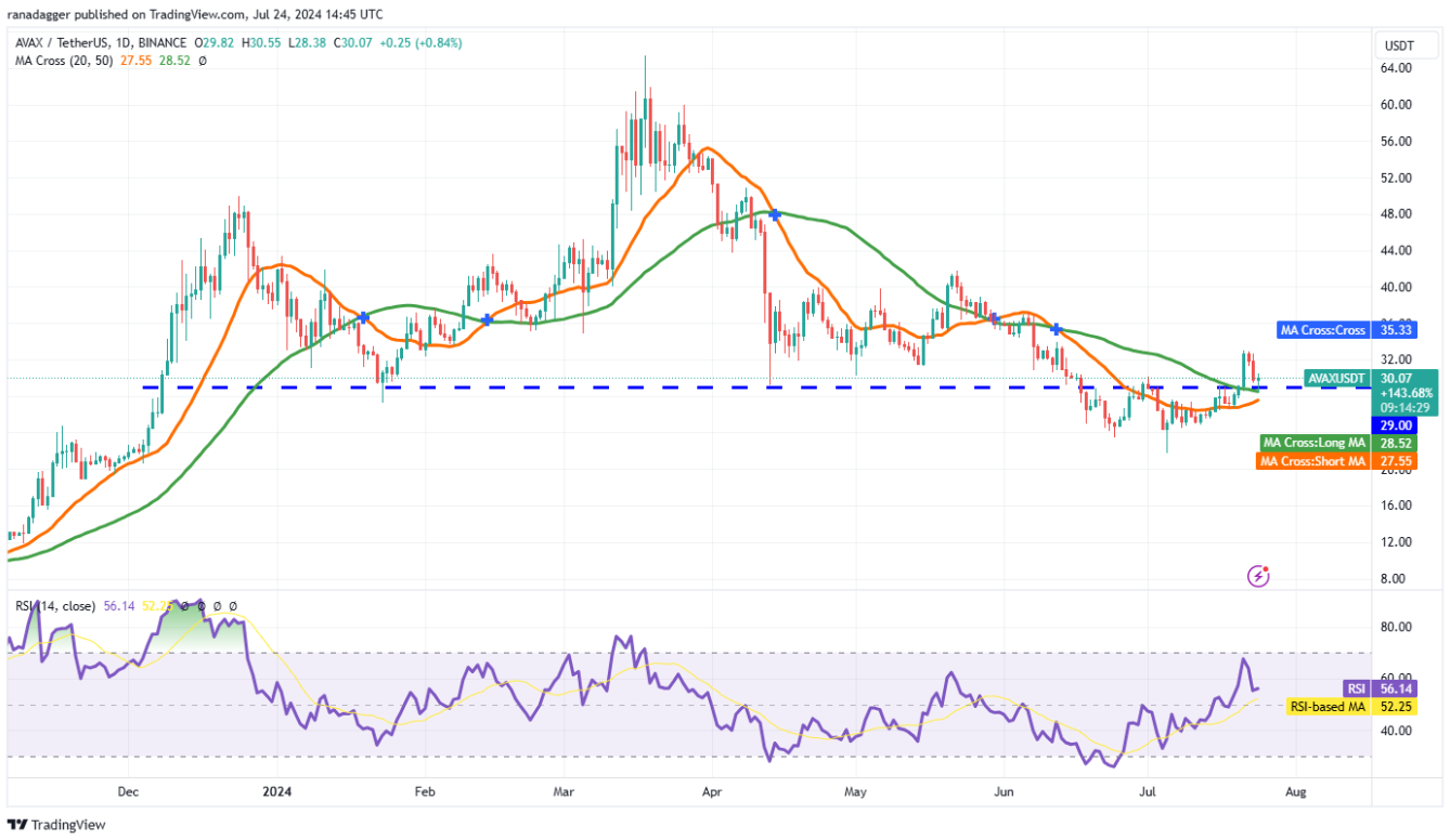 Avalanche (AVAX) đã giảm từ $33 vào ngày 21 tháng 7 và đạt đến đường trung bình động vào ngày 24 tháng 7, cho thấy nhu cầu ở các mức cao hơn không cao.