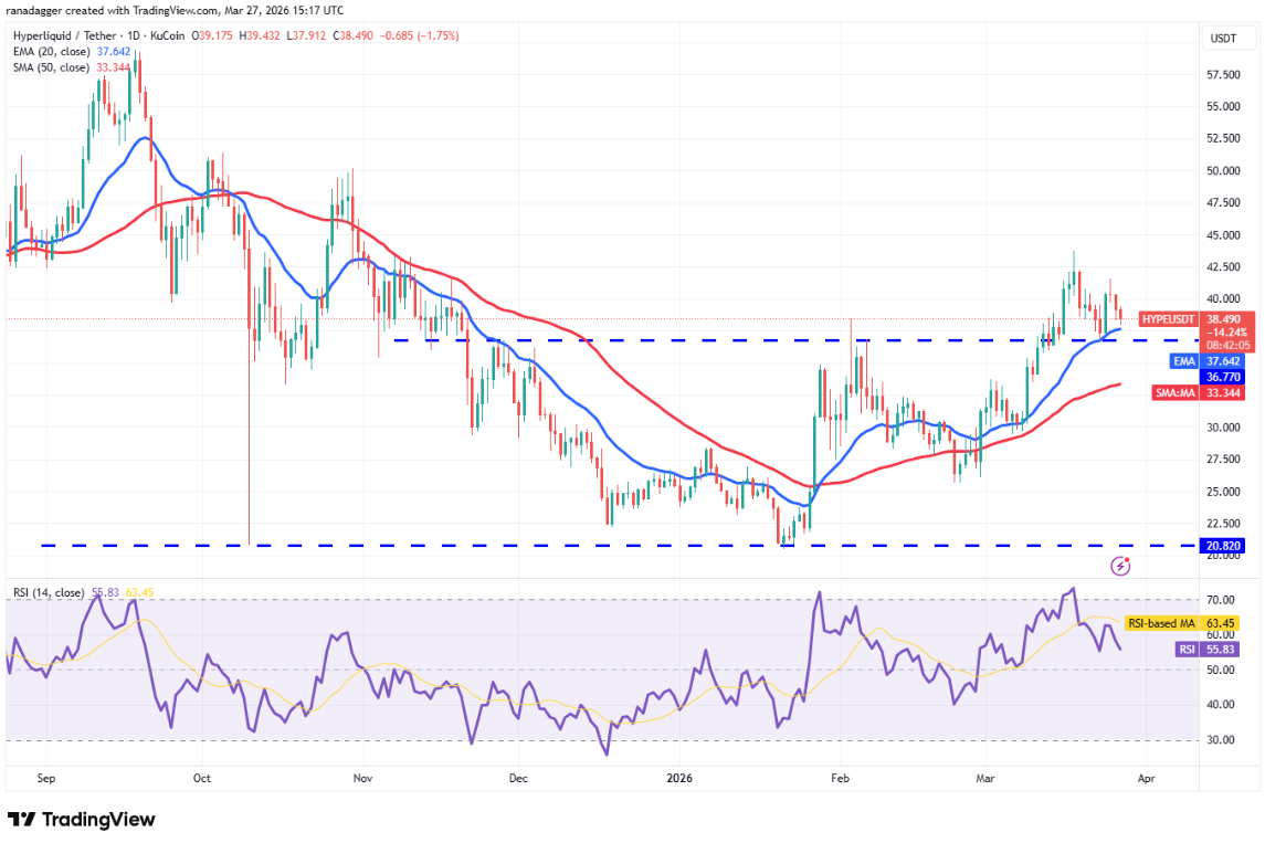 Hyperliquid (HYPE) đã giảm từ $41,59 vào thứ Tư nhưng nhiều khả năng sẽ tìm được hỗ trợ trong vùng giữa EMA 20 ngày ($37,64) và mức bứt phá $36,77.
