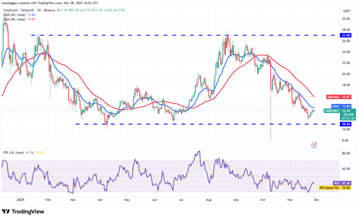 Giá Chainlink (LINK) đang chịu áp lực bán gần đường EMA 20 ngày (13,84 USD), tuy nhiên một tín hiệu tích cực là phe bò vẫn chưa nhường nhiều lợi thế cho phe gấu.