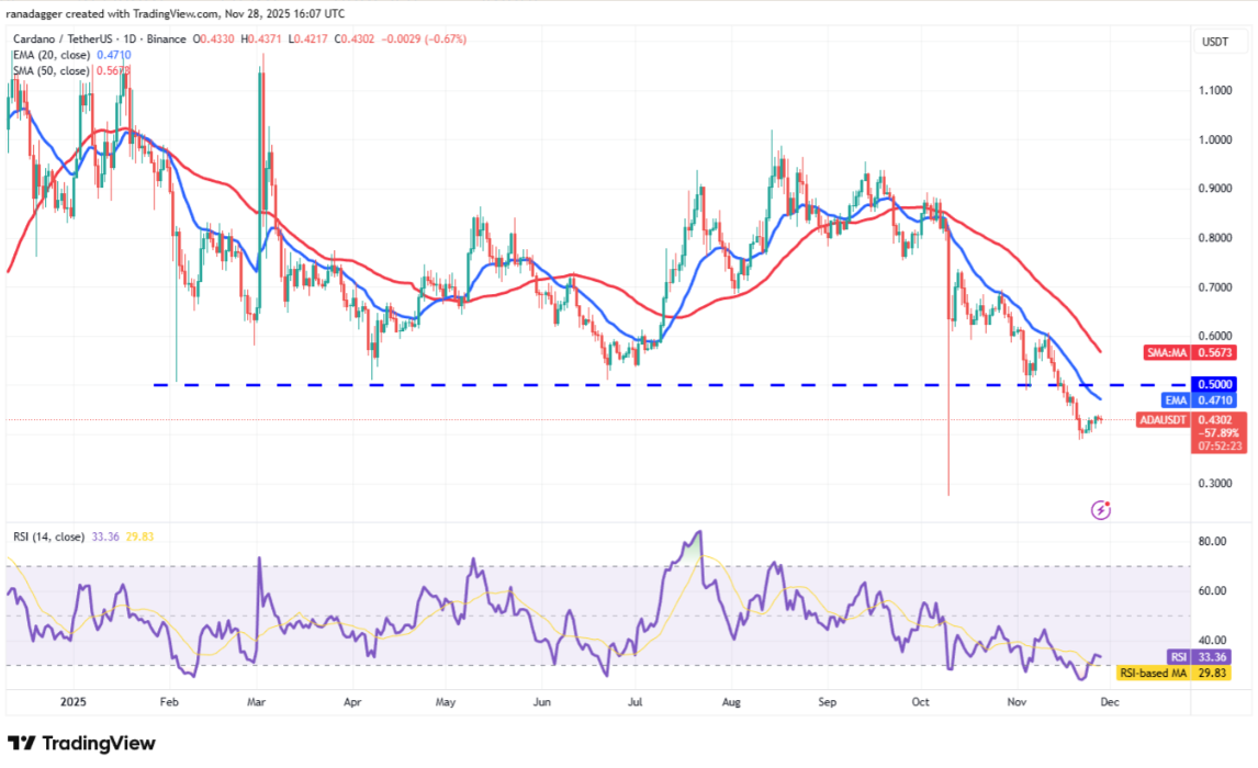 Giá Cardano (ADA) đang gặp khó khăn trong việc tiếp cận đường EMA 20 ngày (0,47 USD), cho thấy nhu cầu từ phe bò vẫn còn yếu.