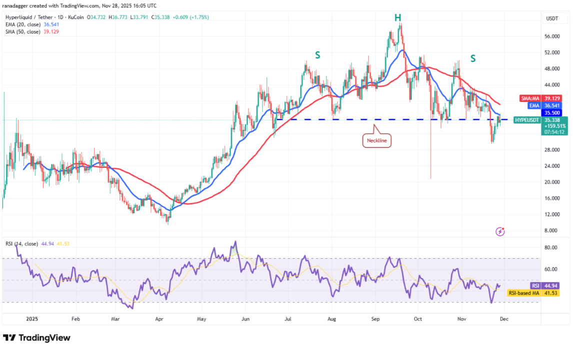 Phe gấu đang nỗ lực kìm hãm đà phục hồi của Hyperliquid (HYPE) tại đường EMA 20 ngày (36,54 USD), tuy nhiên phe bò vẫn tiếp tục duy trì áp lực.