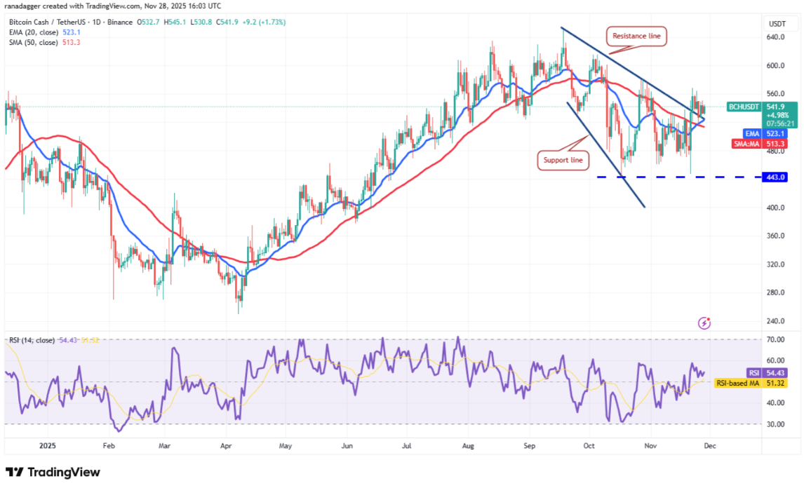 Đường EMA 20 ngày (523 USD) đã bắt đầu hướng lên, trong khi RSI nằm trên ngưỡng trung tính, cho thấy lợi thế đang nghiêng nhẹ về phe bò. Để khởi động một đợt tăng mới, phe bò cần đẩy giá Bitcoin Cash vượt mốc 568 USD, qua đó mở ra đà tăng lên 580 USD và tiếp theo là 606 USD.