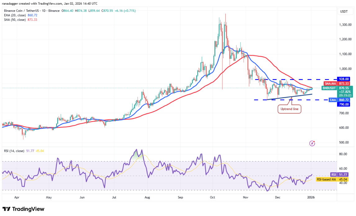 Phe gấu đang cố gắng bảo vệ đường SMA 50 ngày tại 873 USD, nhưng tín hiệu tích cực là phe bò BNB vẫn duy trì được áp lực tăng giá