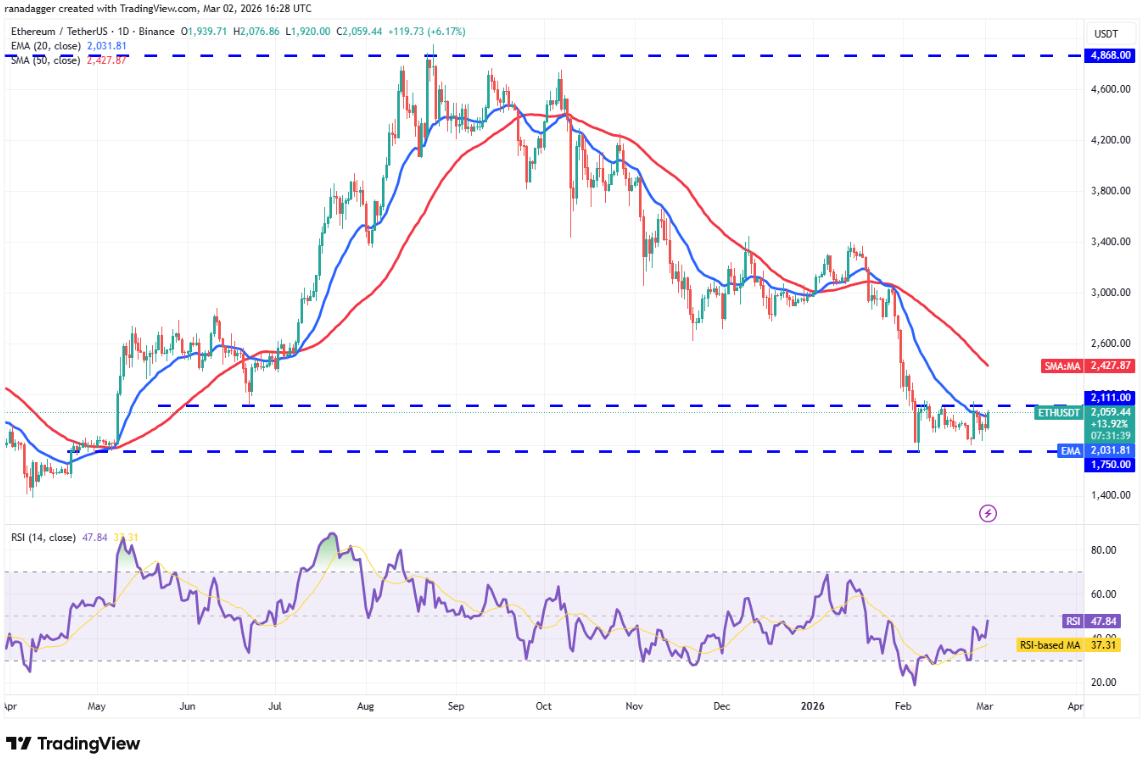 Ether (ETH) hiện vẫn đi ngang trong vùng từ 1.750 đến 2.111 USD, cho thấy cuộc giằng co gay gắt giữa phe bò và phe gấu.