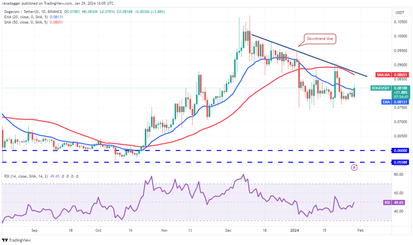 Phe bò đã thất bại trong việc đẩy Dogecoin (DOGE) lên trên đường EMA 20 ngày ($0,08) vào ngày 28 tháng 1 nhưng vẫn duy trì áp lực và vượt qua rào cản vào ngày 29 tháng 1.