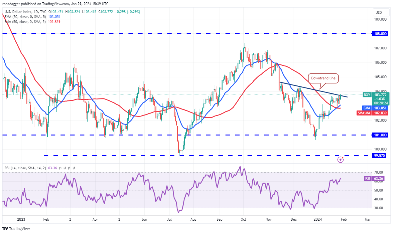 Đường EMA 20 ngày tăng (103) và chỉ số sức mạnh tương đối (RSI) nằm trong vùng tích cực cho thấy con đường ít trở ngại nhất là hướng lên. Nếu người mua đẩy và duy trì giá trên đường xu hướng giảm, chỉ số có thể tăng lên 104,50 và sau đó là 106.