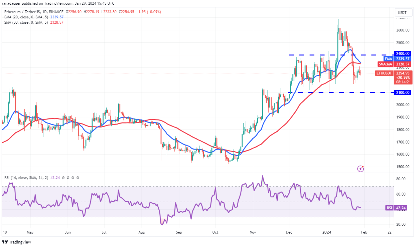 Người mua đã cố gắng đẩy Bitcoin lên trên đường SMA 50 ngày ($42.795) vào ngày 28 và 29 tháng 1, nhưng phe gấu vẫn giữ vững lập trường. Các đường trung bình động đi ngang và chỉ số RSI gần điểm giữa không mang lại lợi thế rõ ràng cho phe bò hay phe gấu.