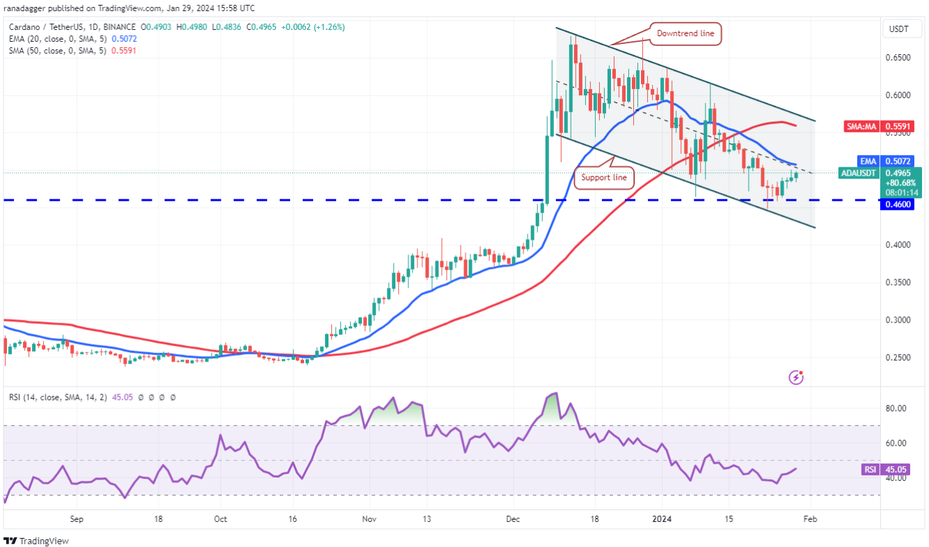 Đợt pullback của Cardano (ADA) đã đạt đến đường EMA 20 ngày ($0,50) vào ngày 28 tháng 1, đường này đang hoạt động như một ngưỡng kháng cự mạnh, như được thấy từ bấc dài trên thanh nến trong ngày.