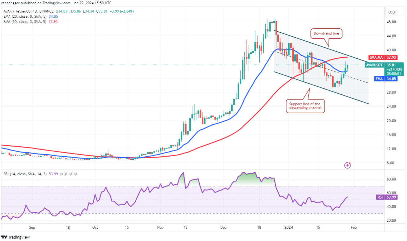 Avalanche (AVAX) đã tăng trên đường EMA 20 ngày ($34) vào ngày 28 tháng 1, cho thấy phe bò đang cố gắng quay trở lại, nhưng bấc dài trên thanh nến cho thấy phe gấu có thể không dễ dàng bỏ cuộc.