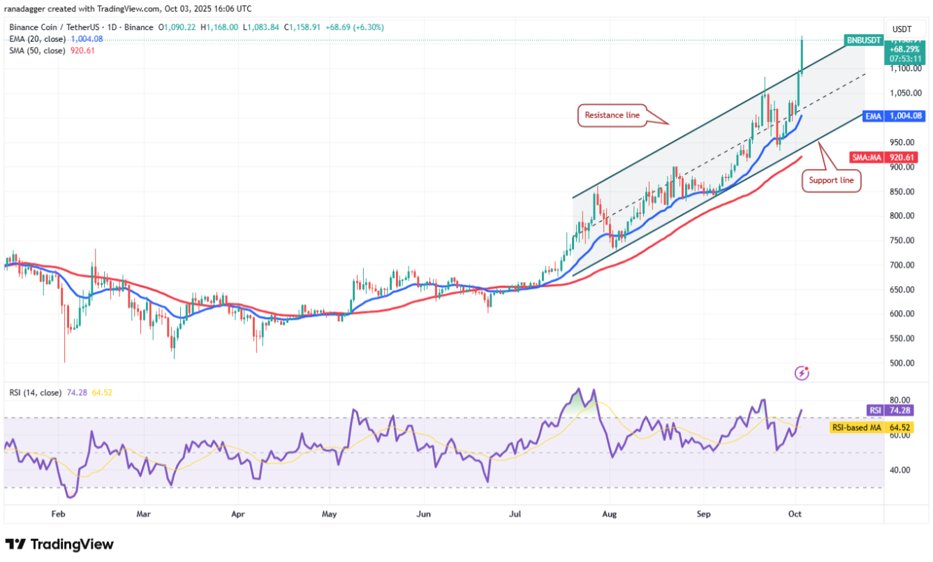 BNB đã lập đỉnh lịch sử mới trên 1.084 USD hôm thứ Năm và tiếp tục mở rộng đà tăng trong phiên thứ Bảy, đạt 1.187,95 USD.