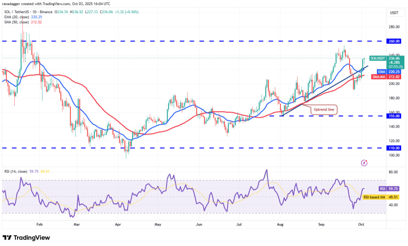 Nếu xuất hiện nhịp thoái lui từ vùng giá hiện tại, đường EMA 20 ngày quanh $220 nhiều khả năng sẽ đóng vai trò hỗ trợ vững chắc. Từ đây, cặp SOL/USDT có thể bứt phá hướng đến ngưỡng kháng cự $260. Tuy nhiên, phe gấu chắc chắn sẽ dốc toàn lực bảo vệ mốc này, bởi chỉ cần giá đóng cửa vượt lên trên $260, Solana có thể nhanh chóng tăng tốc tiến về $295.