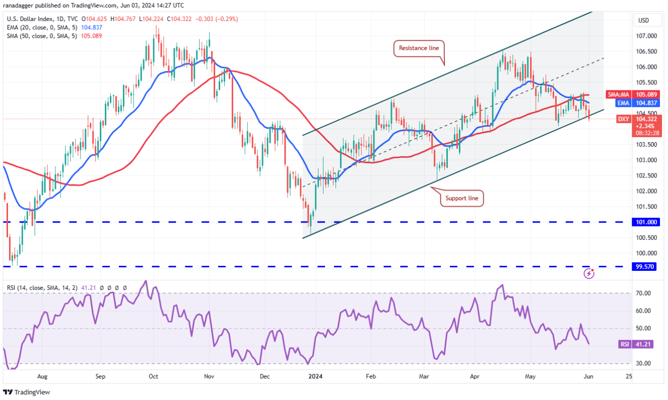Chỉ số đô la Mỹ (DXY) đã giảm từ SMA 50 ngày (105) vào ngày 30 tháng 5 và trượt xuống dưới đường hỗ trợ của kênh tăng dần vào ngày 3 tháng 6.