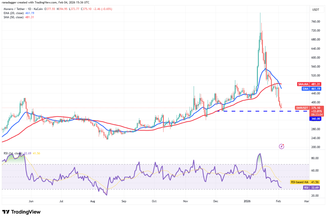 Monero (XMR) đang cố gắng giữ hỗ trợ tại mốc 360 USD, tuy nhiên nhịp hồi phục nhiều khả năng sẽ gặp áp lực bán tại 412 USD, sau đó là đường EMA 20 ngày ở 461 USD.