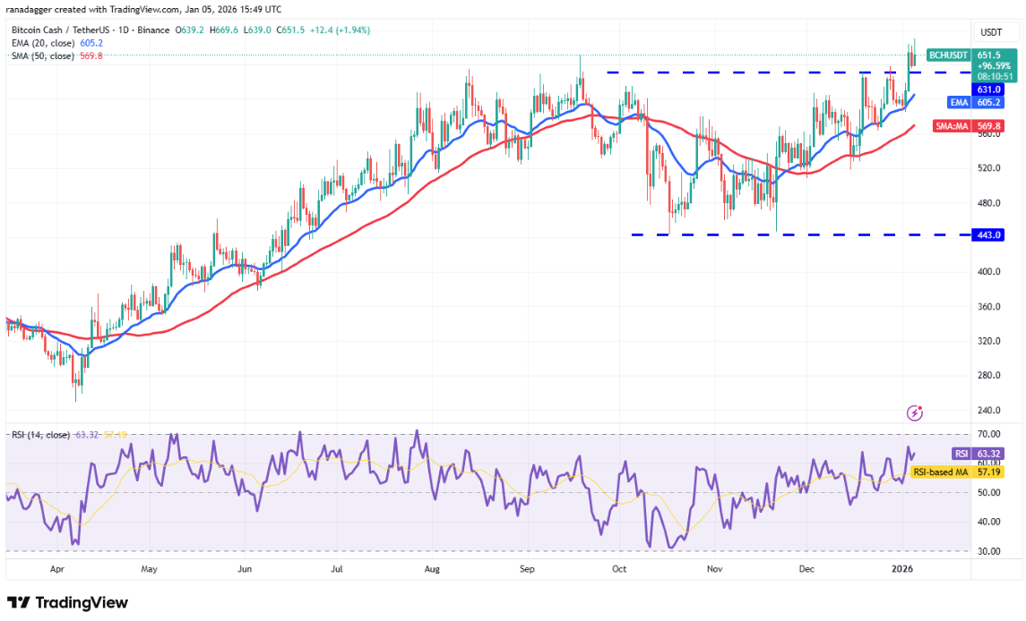 Phe gấu đã cố gắng kéo giá BCH trở lại dưới mức bứt phá 631 USD vào Chủ nhật, nhưng phe bò vẫn trụ vững. Điều này cho thấy phe bò đang nỗ lực biến mốc 631 USD thành vùng hỗ trợ. Cặp BCH/USDT có thể tăng mạnh lên vùng 720 USD, nơi phe gấu được kỳ vọng sẽ phòng thủ quyết liệt.