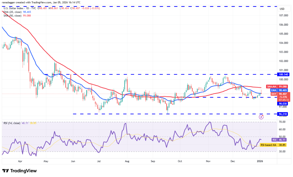 Chỉ số Dollar Mỹ (DXY) đã tăng trở lại trên đường EMA 20 ngày tại 98,46, tuy nhiên bóng nến dài cho thấy áp lực bán xuất hiện gần đường SMA 50 ngày ở 99,08.