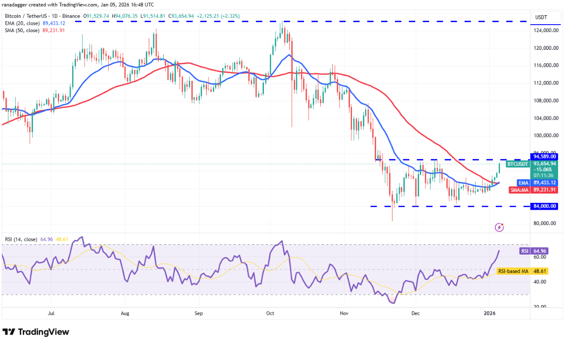 Các đường trung bình động đang tiến gần tới giao cắt tăng giá, trong khi chỉ số RSI nằm trong vùng tích cực, cho thấy phe bò đang chiếm ưu thế. Nếu người mua vượt qua được mốc 94.589 USD, giá Bitcoin có thể tăng vọt lên mốc tâm lý 100.000 USD và xa hơn là 107.500 USD.