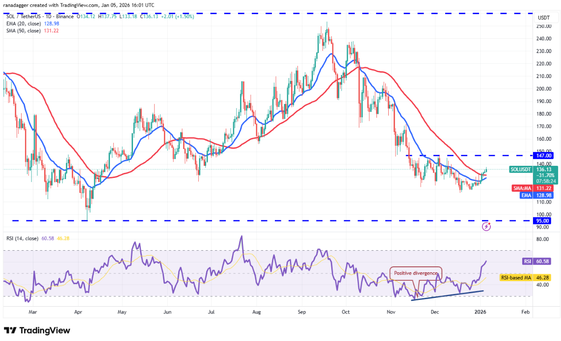 Nếu giá điều chỉnh từ vùng kháng cự 147 USD, nhiều khả năng sẽ tìm được hỗ trợ tại EMA 20 ngày. Diễn biến này cho thấy tâm lý thị trường đang cải thiện và phe bò sẵn sàng mua vào khi giá điều chỉnh. Điều đó làm tăng khả năng SOL vượt mốc 147 USD, qua đó cặp SOL/USDT có thể tiến lên vùng 172 USD.