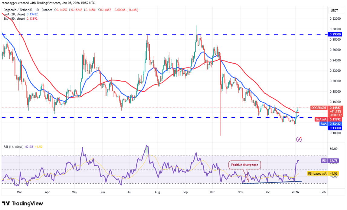 Dogecoin (DOGE) đã bứt phá lên trên các đường trung bình động vào thứ Sáu, cho thấy thị trường đã bác bỏ kịch bản phá vỡ xuống dưới mốc 0,13 USD.
