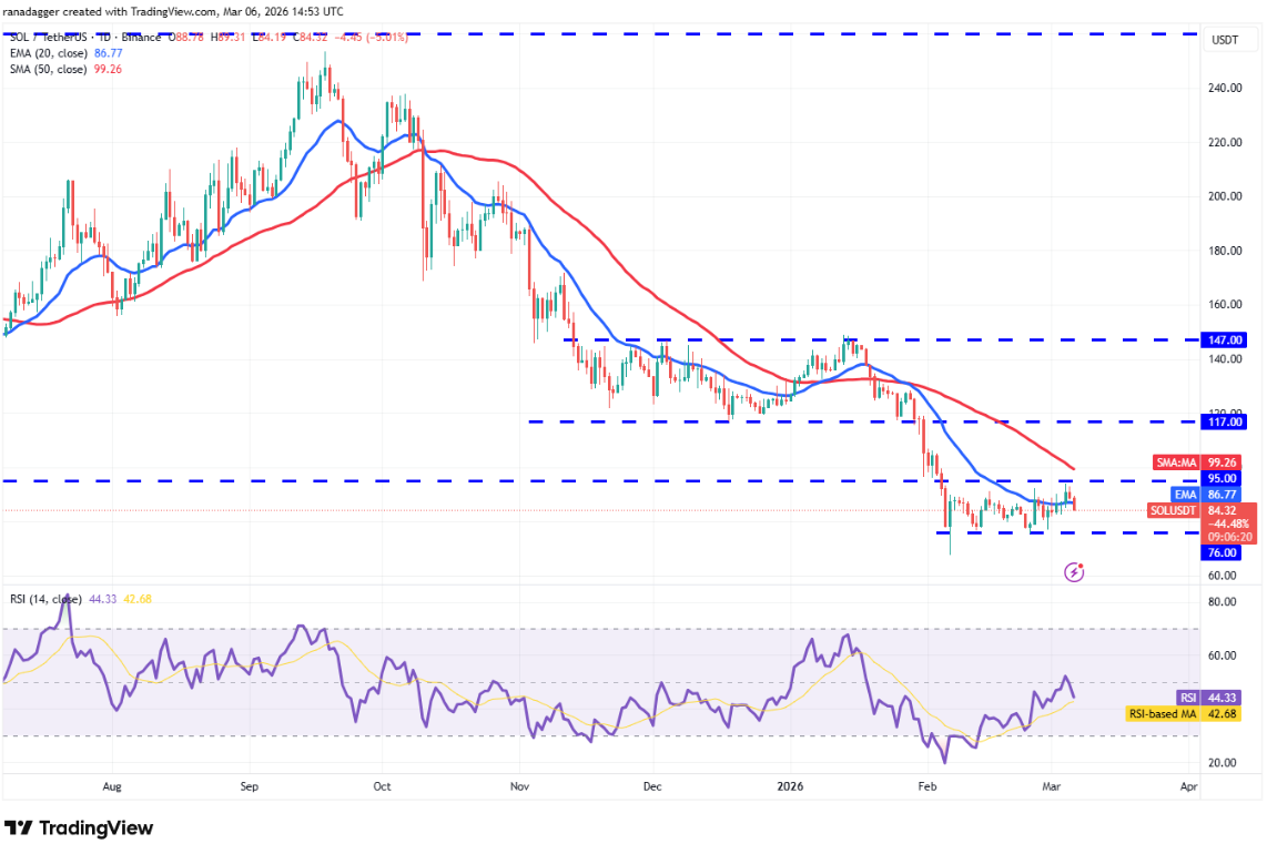 Solana quay đầu từ 95 USD và đã giảm xuống dưới đường EMA 20 ngày (86 USD).
