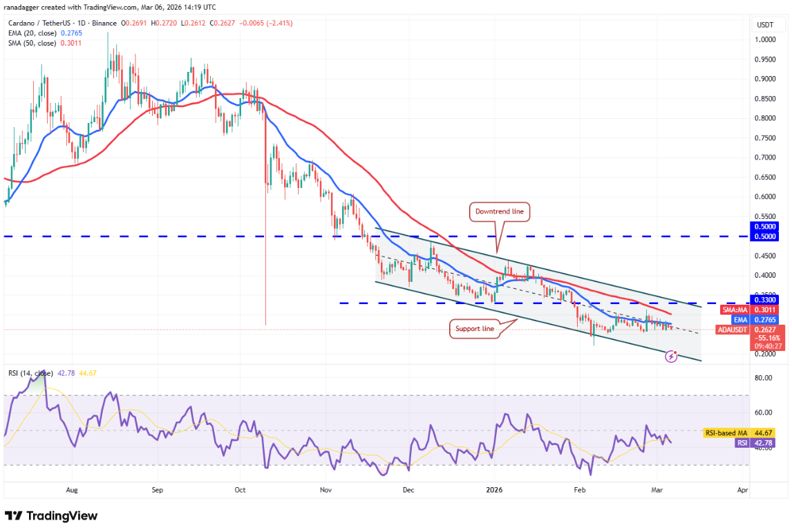Phe gấu đang cố kéo giá xuống dưới hỗ trợ 1,27 USD. Nếu thành công, giá XRP có thể giảm về đường hỗ trợ của kênh giảm.