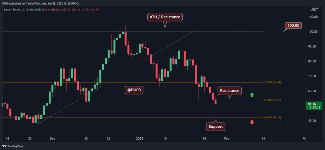 Mức hỗ trợ trước đây tại 54 đô la hiện đã chuyển thành kháng cự và các chỉ số đang rơi tự do. Chỉ báo RSI hàng ngày vẫn chưa chạm đến vùng quá bán, báo hiệu LUNA có thể tiếp tục giảm trong một thời gian nữa cho đến khi đạt đến đó và thu hút người mua trở lại.