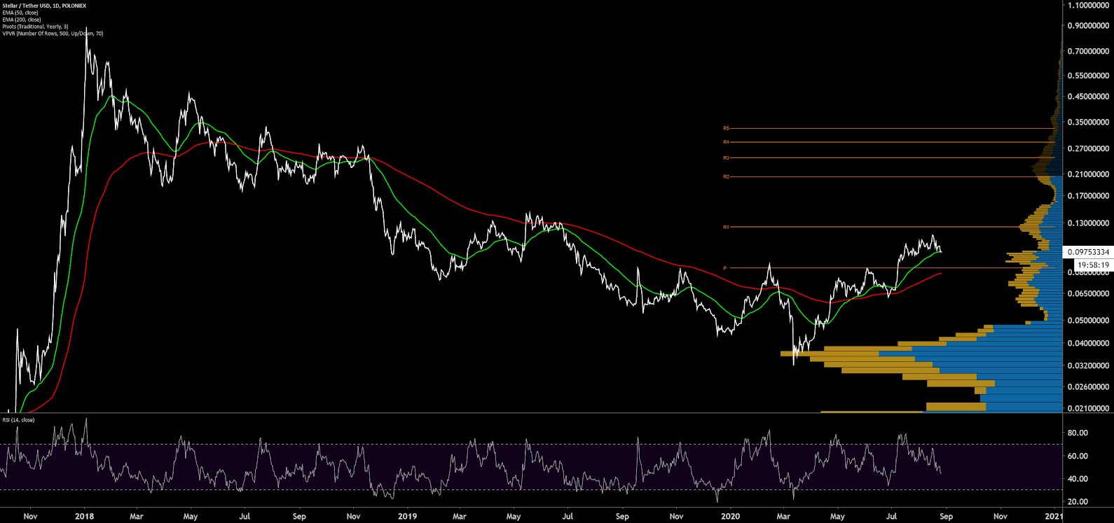 Mặc dù có nhiều nỗ lực củng cố tăng giá kể từ năm 2018 nhưng XLM không thể phát triển xu hướng tăng liên tục. Sức mạnh đảo ngược xu hướng tăng tiềm năng có thể được phân tích dựa trên EMA, phạm vi hiển thị hồ sơ khối lượng, điểm xoay, đám mây Ichimoku và các mô hình biểu đồ.