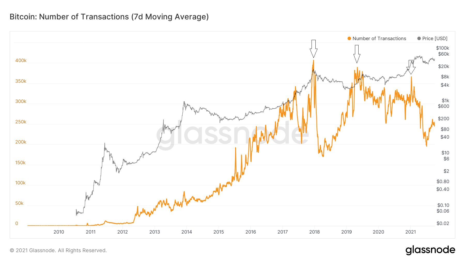Số lượng giao dịch Bitcoin không phải lúc nào cũng tăng cùng với giá. Trong khi số lượng giao dịch đã đạt ATH tại 406.953 vào tháng 12/2017, giá BTC đạt ATH vào tháng 4/2021.