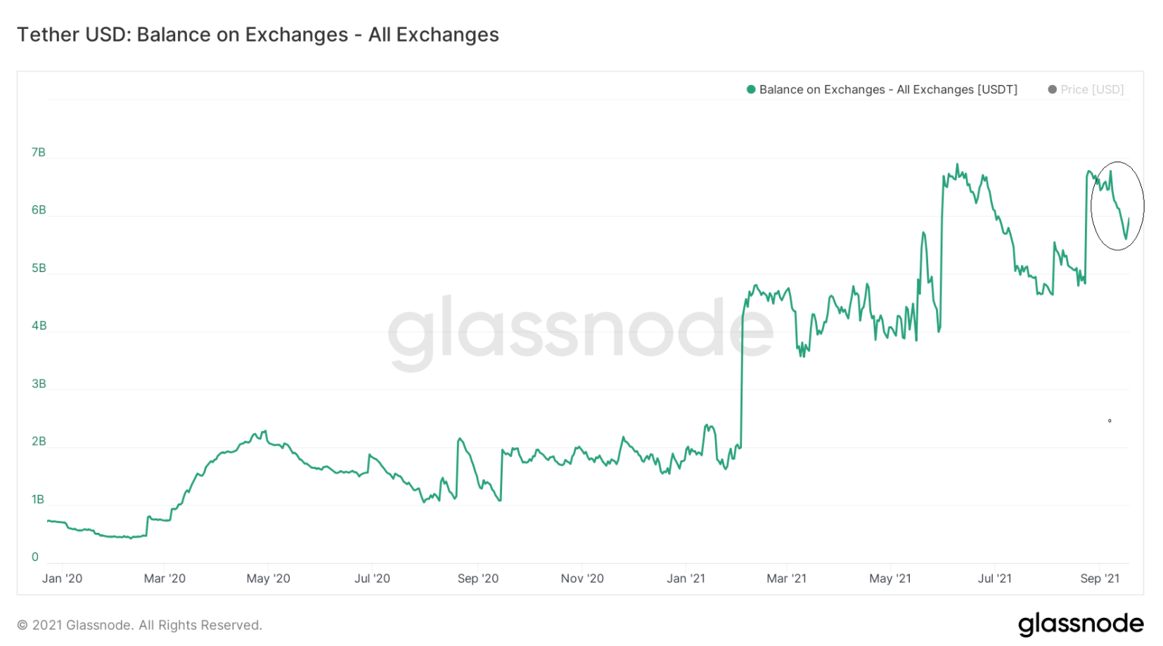 Số dư Tether (USDT) trên các sàn giao dịch đạt mức cao nhất mọi thời đại vào tháng 6 năm 2021. Sau khi giảm, nó đã tạo ra đỉnh thấp hơn vào đầu tháng 9.