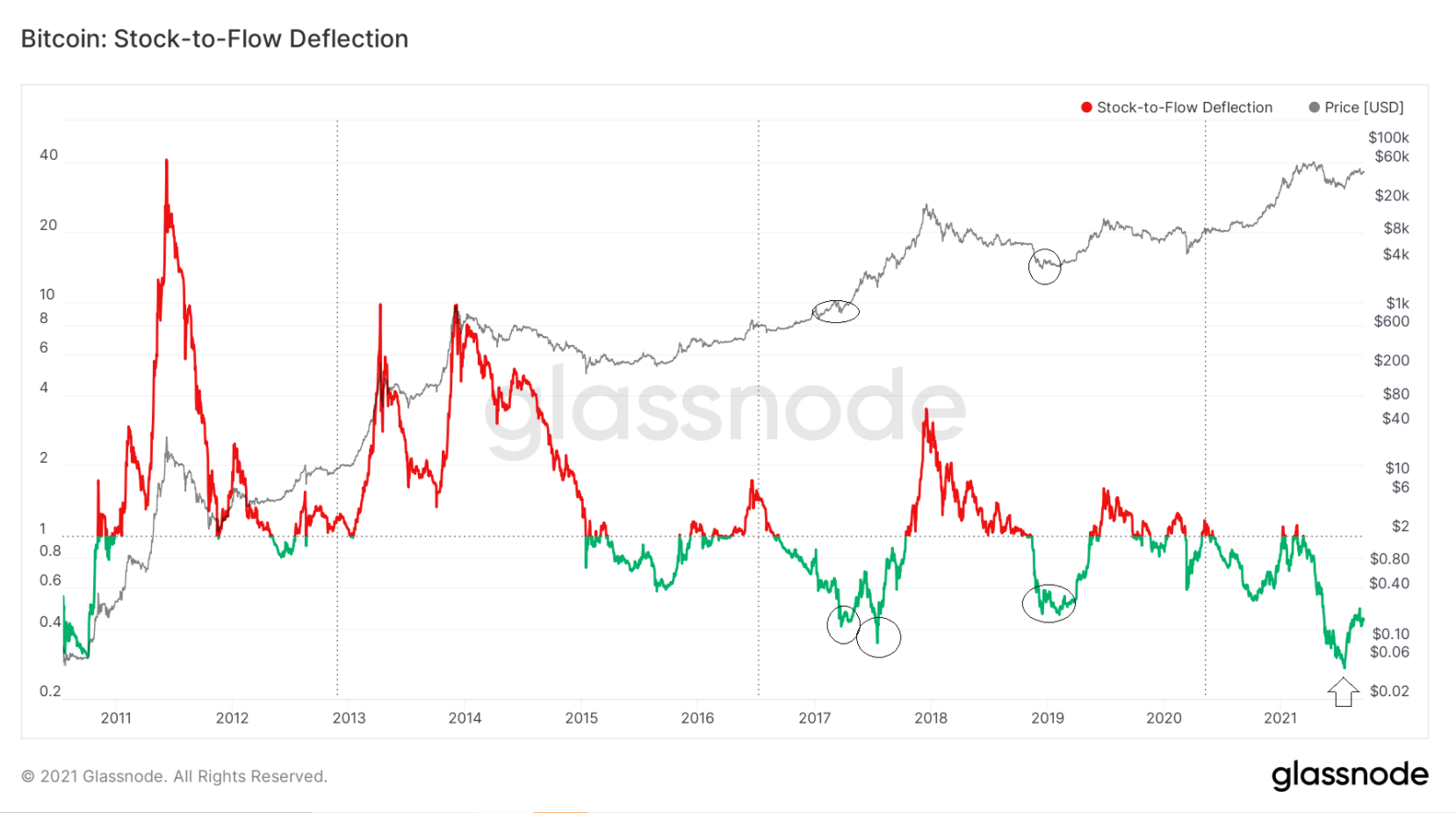 Trước đó, các giá trị gần 0,40 đã đạt được vào tháng 3 năm 2017 và tháng 7 năm 2017 và cả vào tháng 12 năm 2020 đều đánh dấu đáy cục bộ cho Bitcoin.