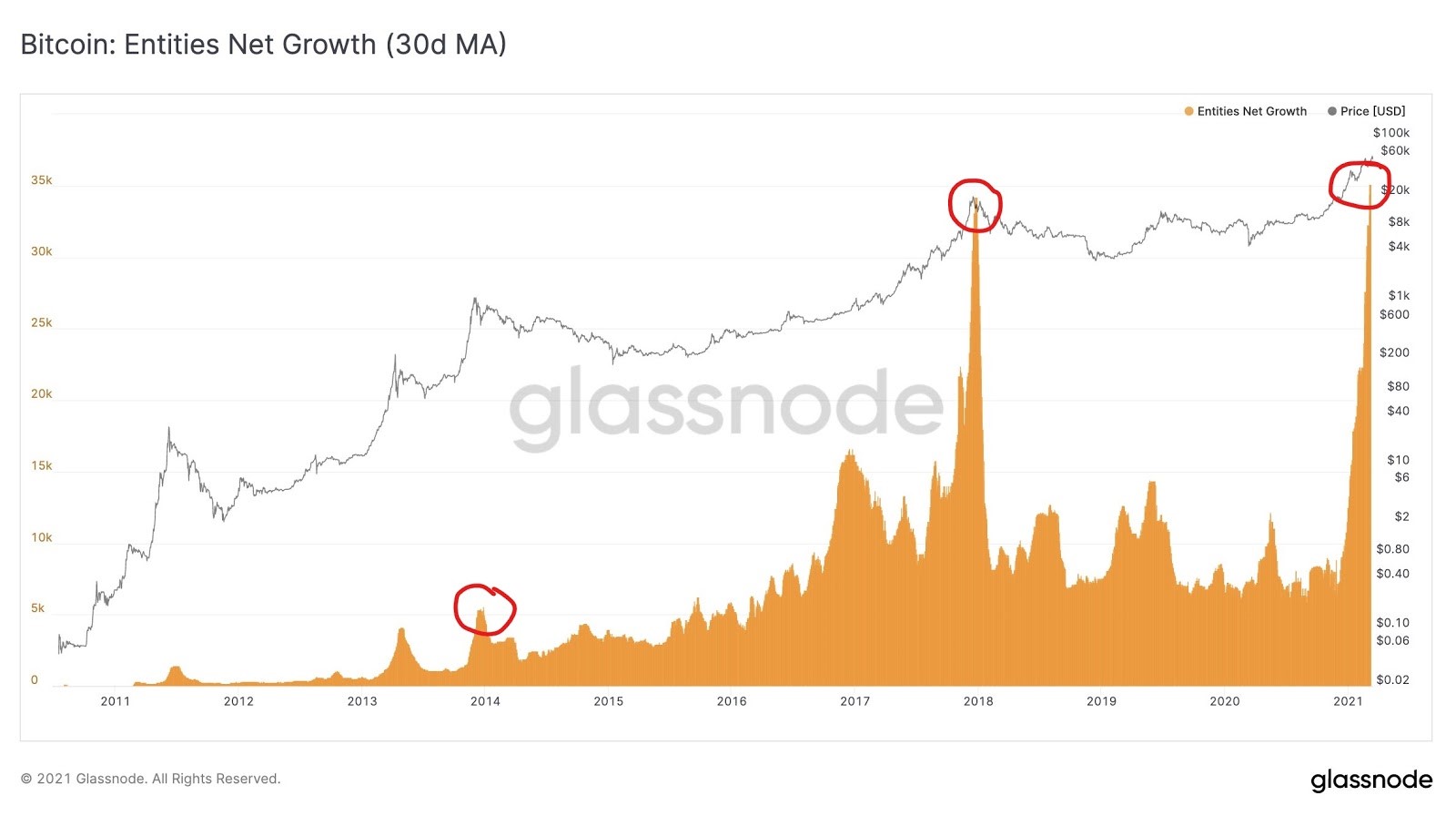 Các biểu đồ phân tích on-chain khác cho thấy số lượng người dùng Bitcoin ngày càng tăng. Thú vị hơn, mức gia tăng hiện tại của thực thể mới gần như ở mức cao nhất của chu kỳ năm 2017, khi Bitcoin chạm mức 20.000 đô la.